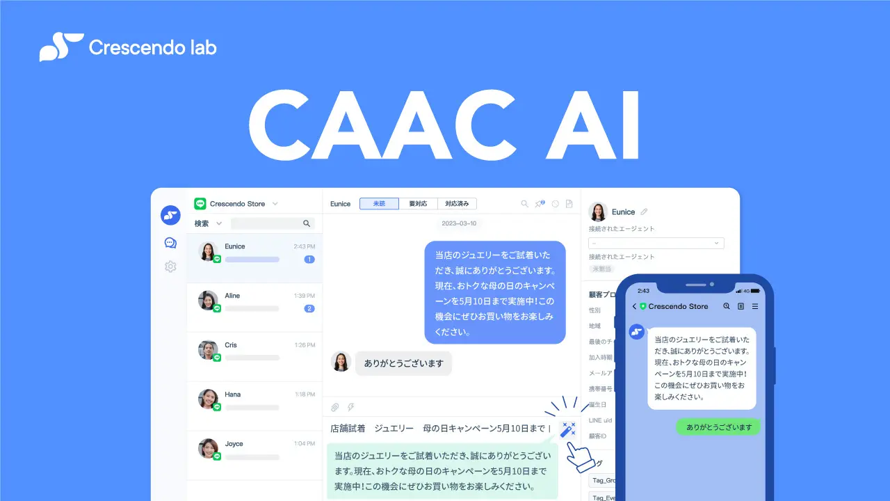LINE公式アカウント向けの総合マーケティングツール「MAAC」およびカスタマーサポートツール「CAAC」を開発、販売するクレッシェンド・ラボは、現在約500の企業にサービスを提供しており、年間約40億通のメッセージ配信をサポートしています。今回、顧客とのコミュニケーション・プラットフォームであるCAACに生成AI(Generative AI)を組み込み、キーワード入力のみで即座に完全なメッセージが生成される機能の追加を発表しました。この機能により、例えば店頭でLINE公式アカウントを追加した顧客へ向けた販促を行う場合、CAAC上で「店舗試着、ジュエリー、母の日キャンペーン5月10日まで」と入力するだけで「当店のジュエリーをご試着いただき誠にありがとうございます。現在、おトクな母の日のキャンペーンを5月10日まで実施中!この機会にぜひお買い物をお楽しみください。」といった完全なメッセージを即座に生成できるようになります。