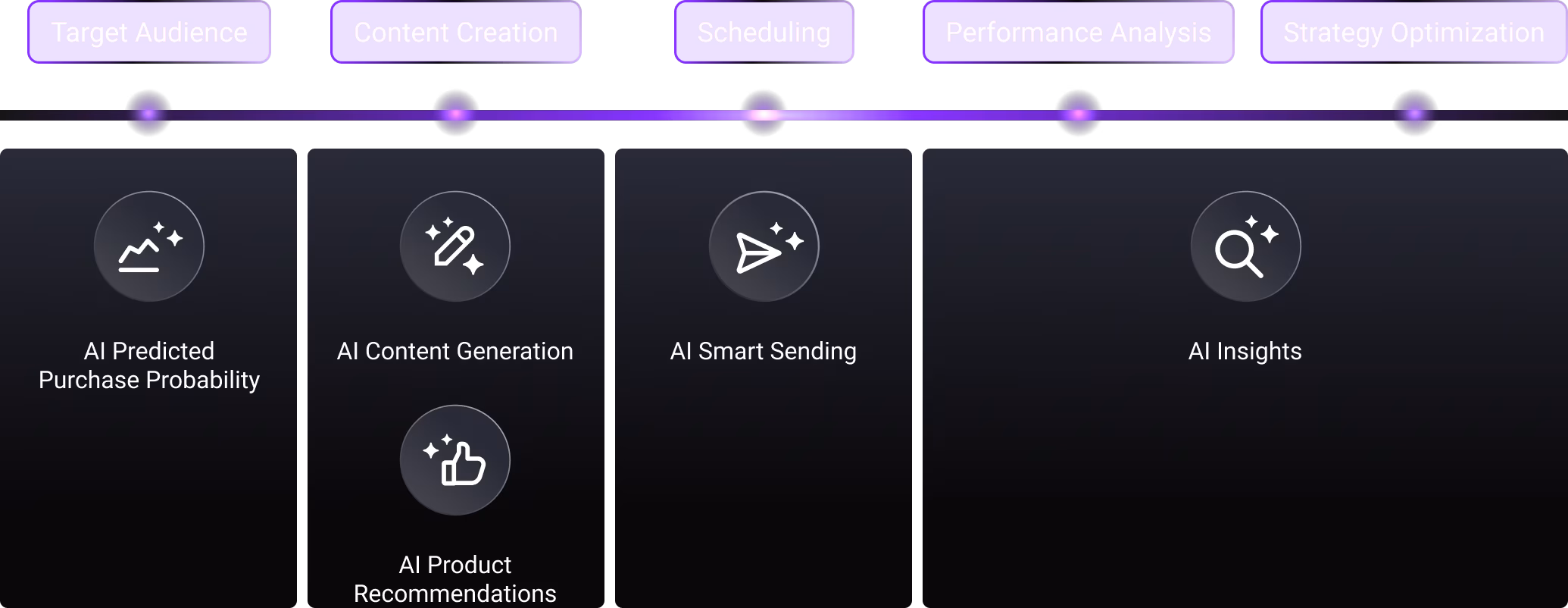 AI Marketing refers to the use of artificial intelligence technologies and machine learning algorithms to collect, analyze, and leverage large volumes of consumer data in marketing activities and strategies. It can also involve using generative AI to automatically create marketing copy, designs, and more. With AI-powered marketing tools, brands can engage with consumers in smarter, more precise, and automated ways—enhancing efficiency, personalization, customer experience, loyalty, and conversion rates.