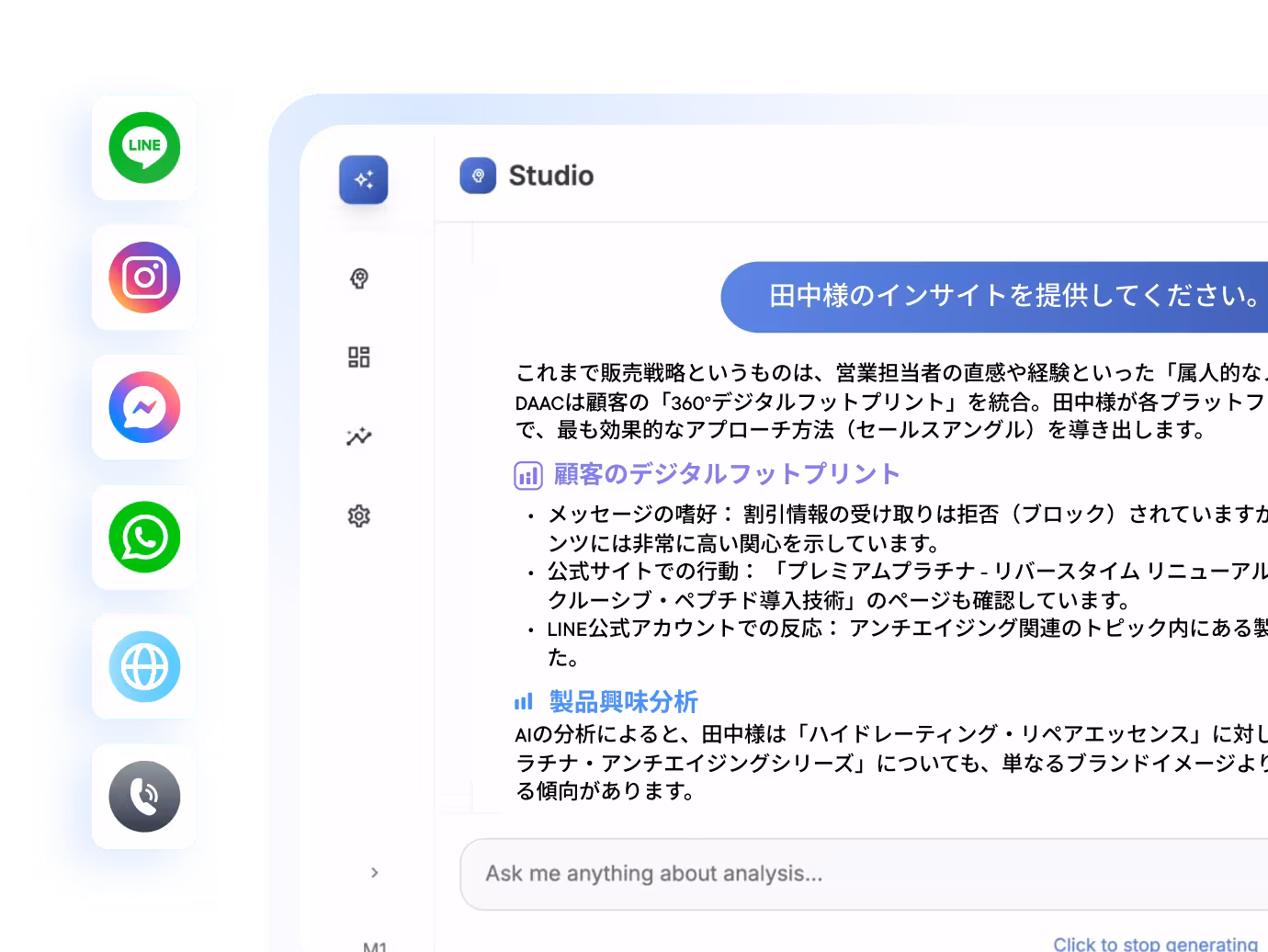 テキストも音声も、蓄積してブランドの資産に チャットのテキストデータと音声通話データを統合し、自社独自のブランドナレッジベースを構築。蓄積されたデータをAIが継続的に分析し、次の戦略的アクション・トークスクリプト改善・サービス品質向上に向けた最適化提案を自動で行います。