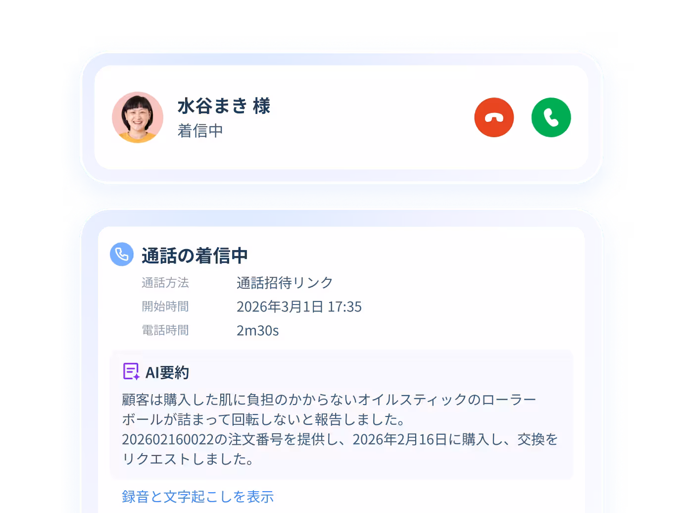 すべての問い合わせを記録し、ひとつも取りこぼさない 不在着信・対応漏れ・エスカレーションが必要なケースをAIが自動検知し、担当者へリアルタイムで通知。高精度な通話レコーディング・文字起こし・AIサマリーにより、顧客ニーズを瞬時に把握して迅速に対応できます。「対応したつもり」をなくし、顧客満足度を底上げします。