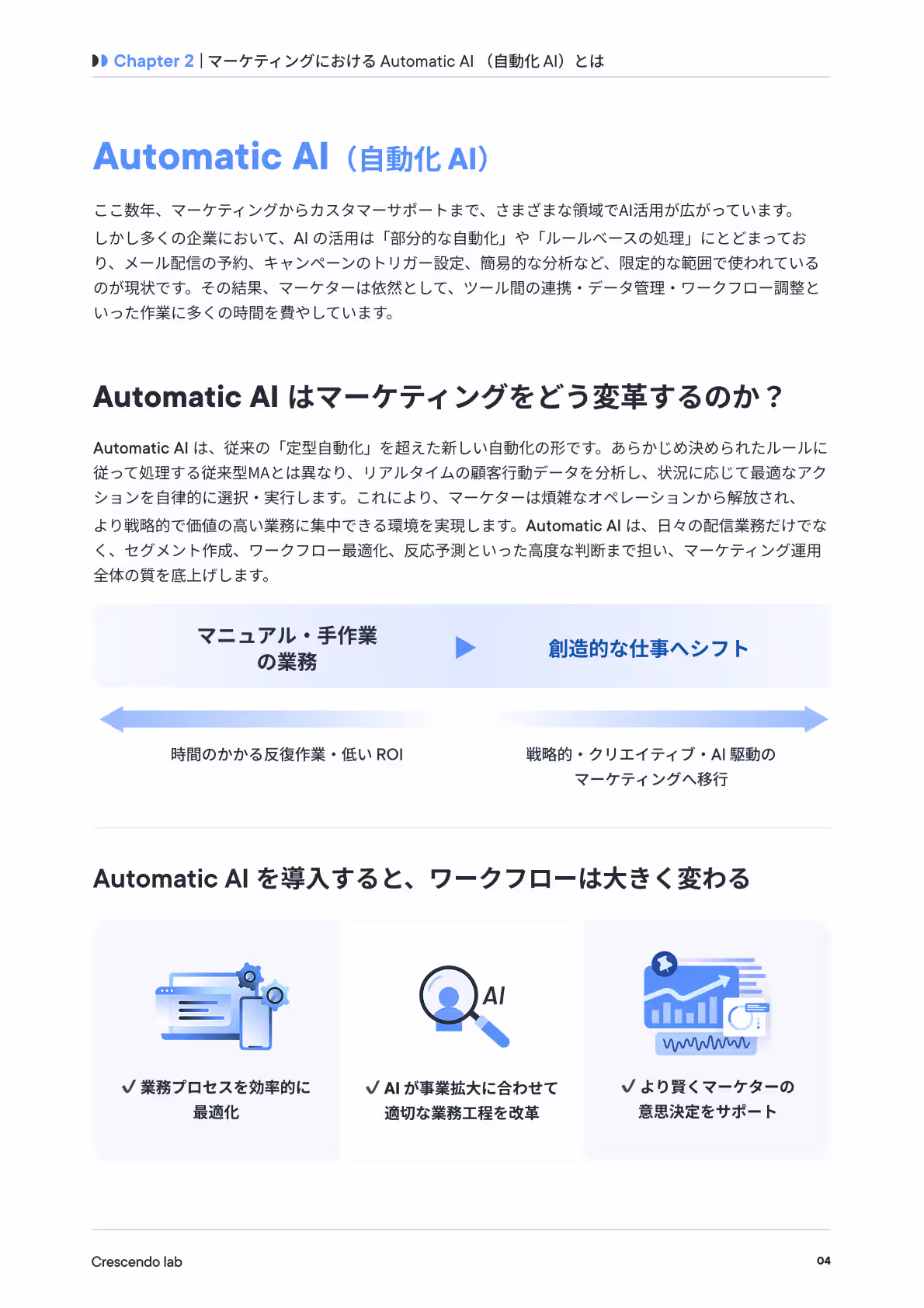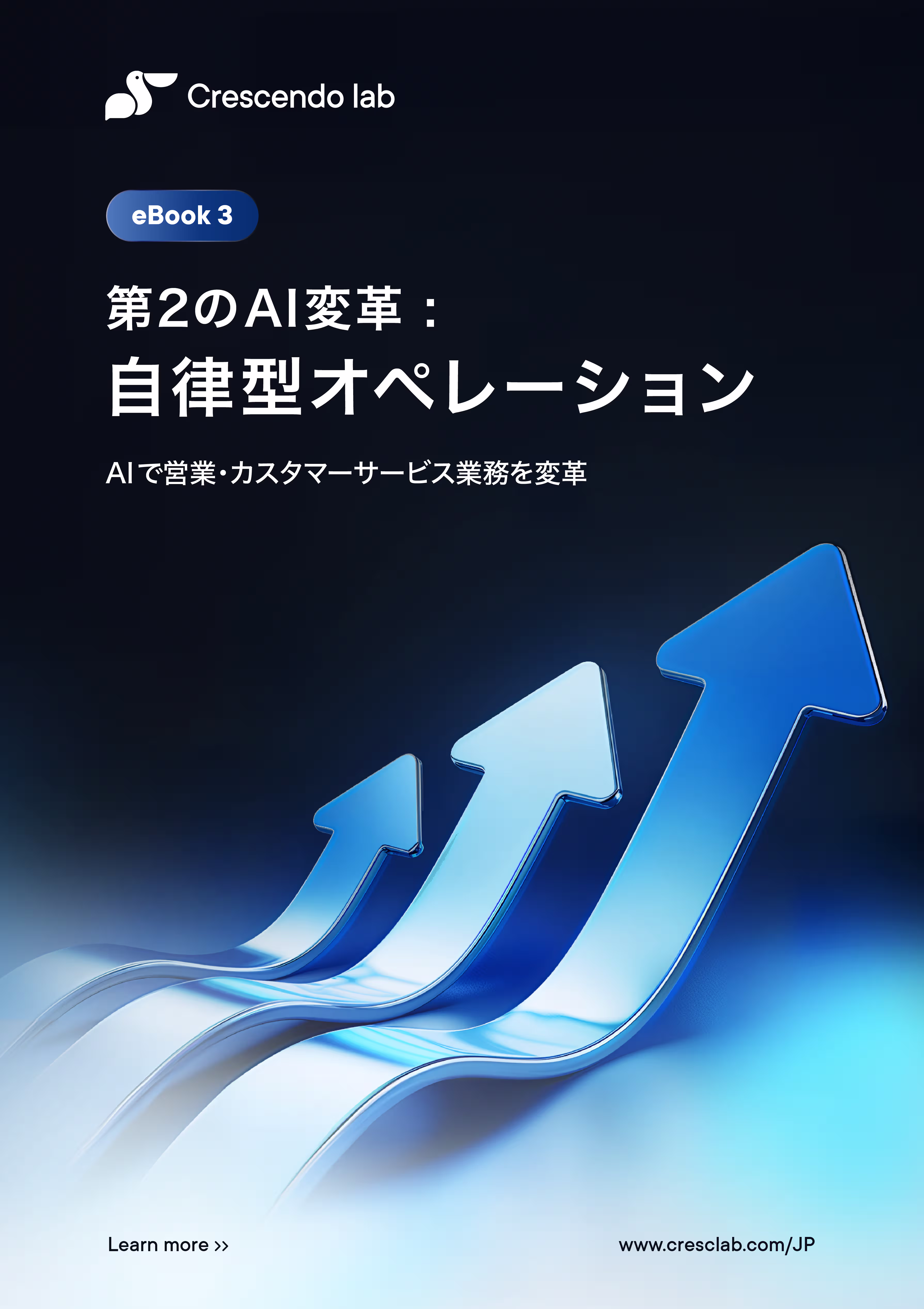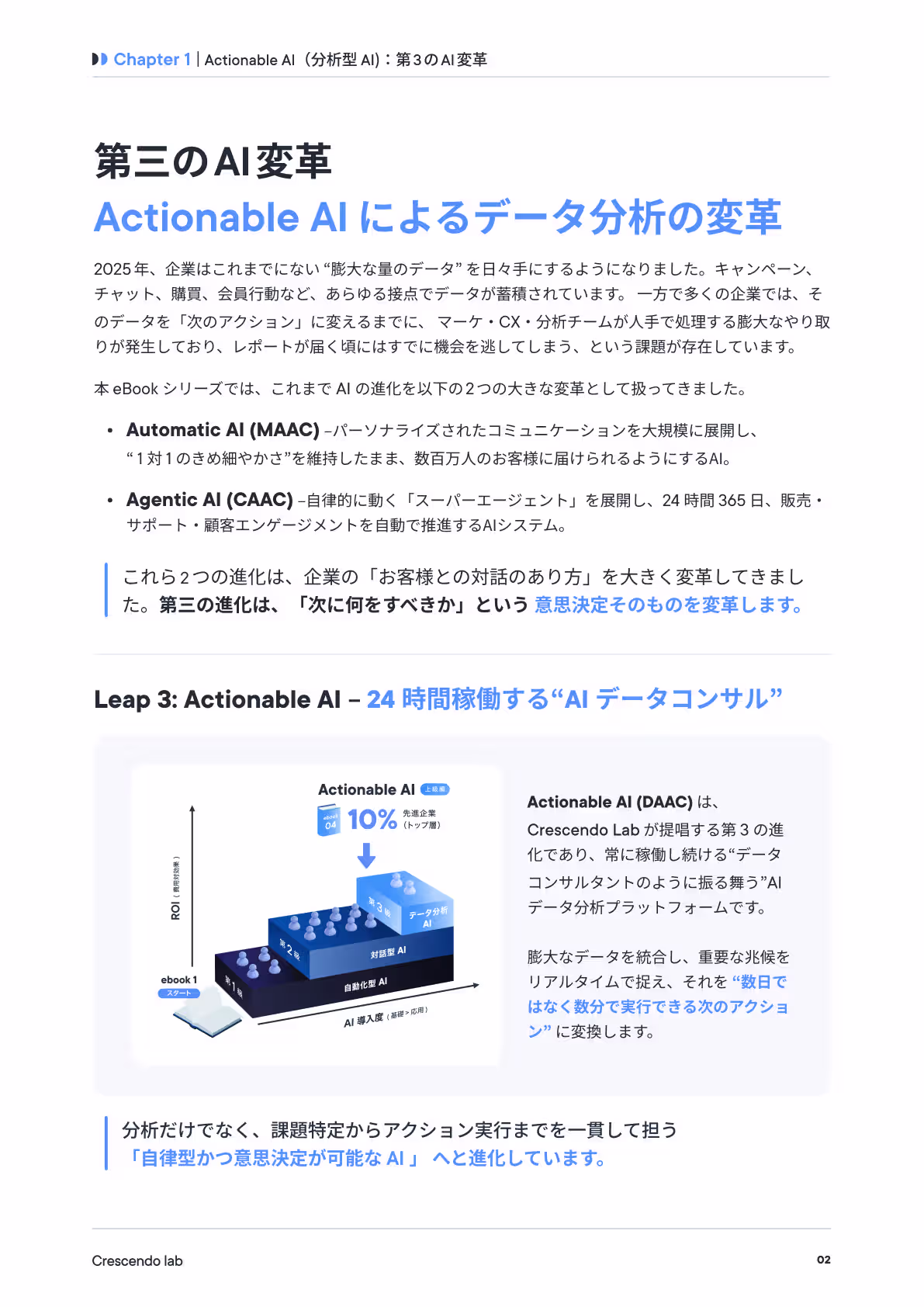 AI導入を成功させるための「自動化 → 判断 → 行動」のステップを体系的に整理し、各段階でクレッシェンドラボの製品がどのように成果に貢献するかを明確に示しています。