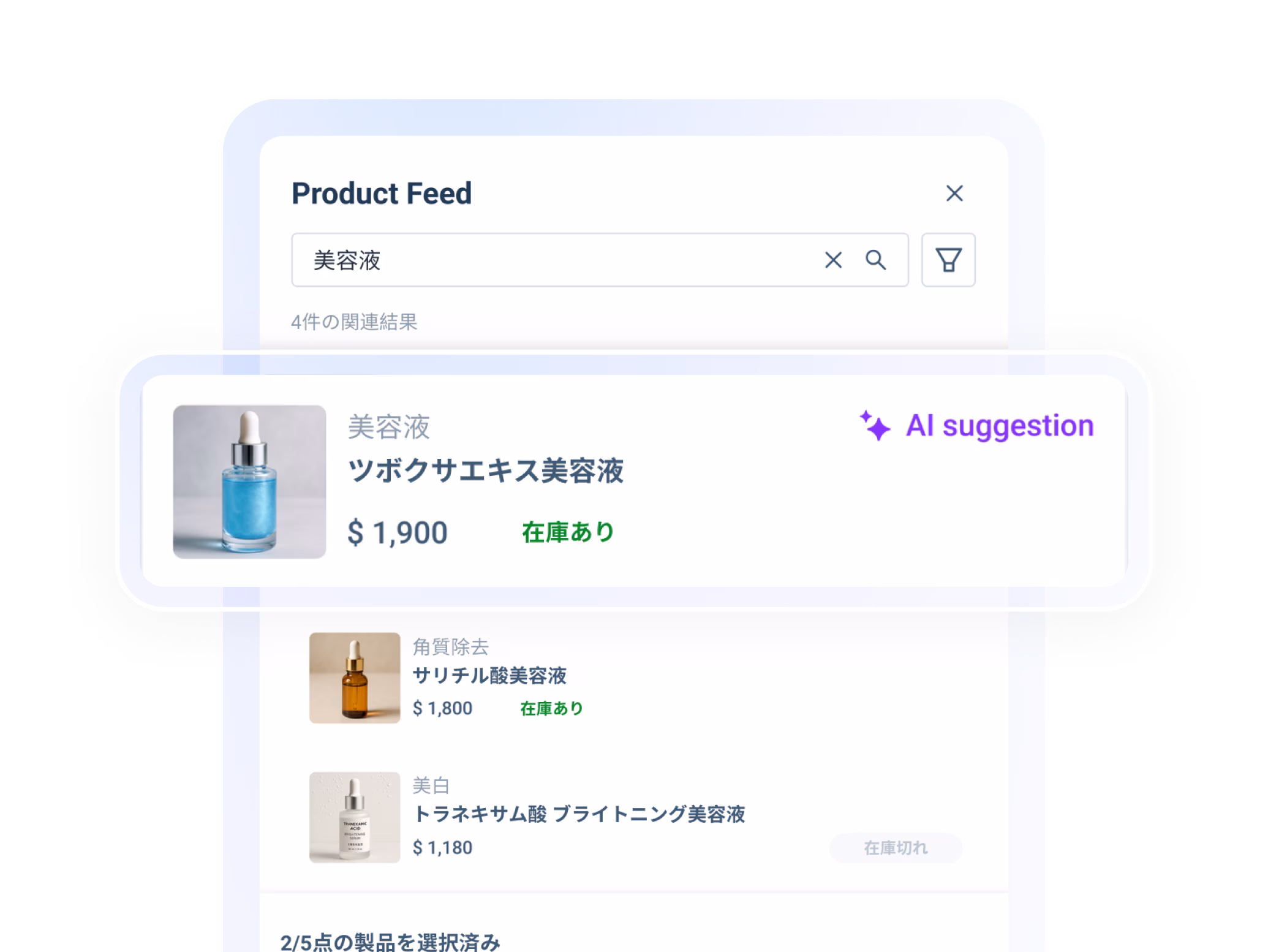 顧客の要望や行動データをもとに、商品フィード内で最も適切なアイテムを「AIおすすめ商品」として自動で提案。購入率や客単価の向上につながります。