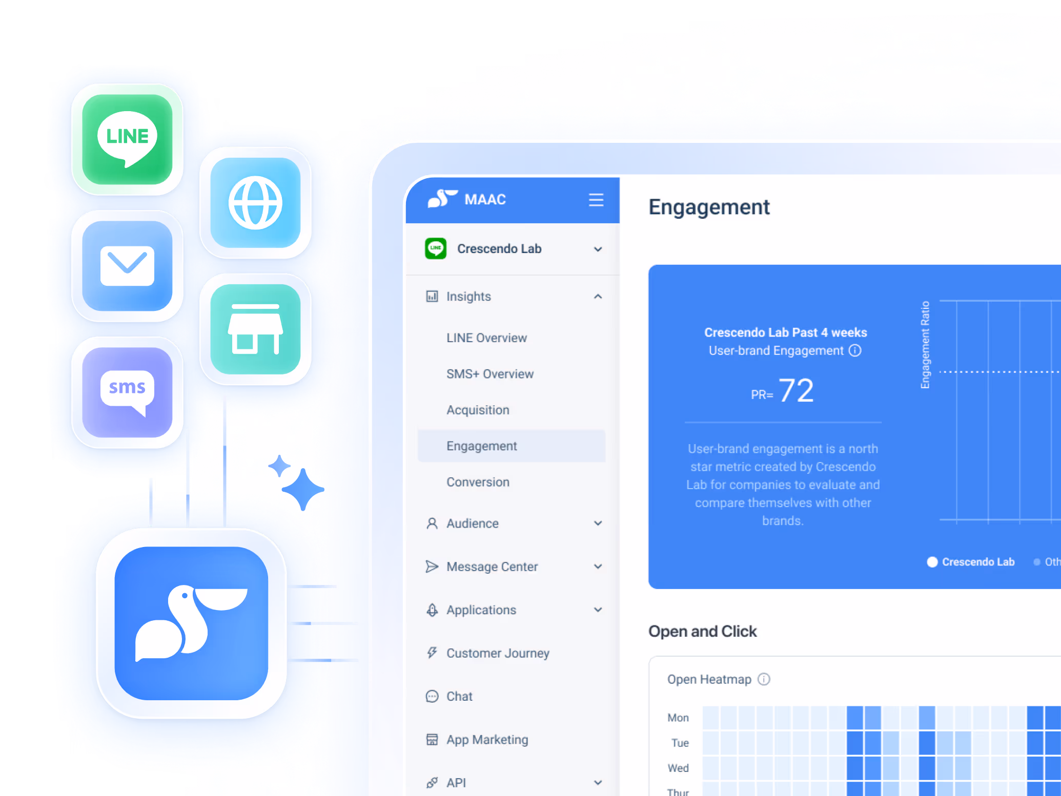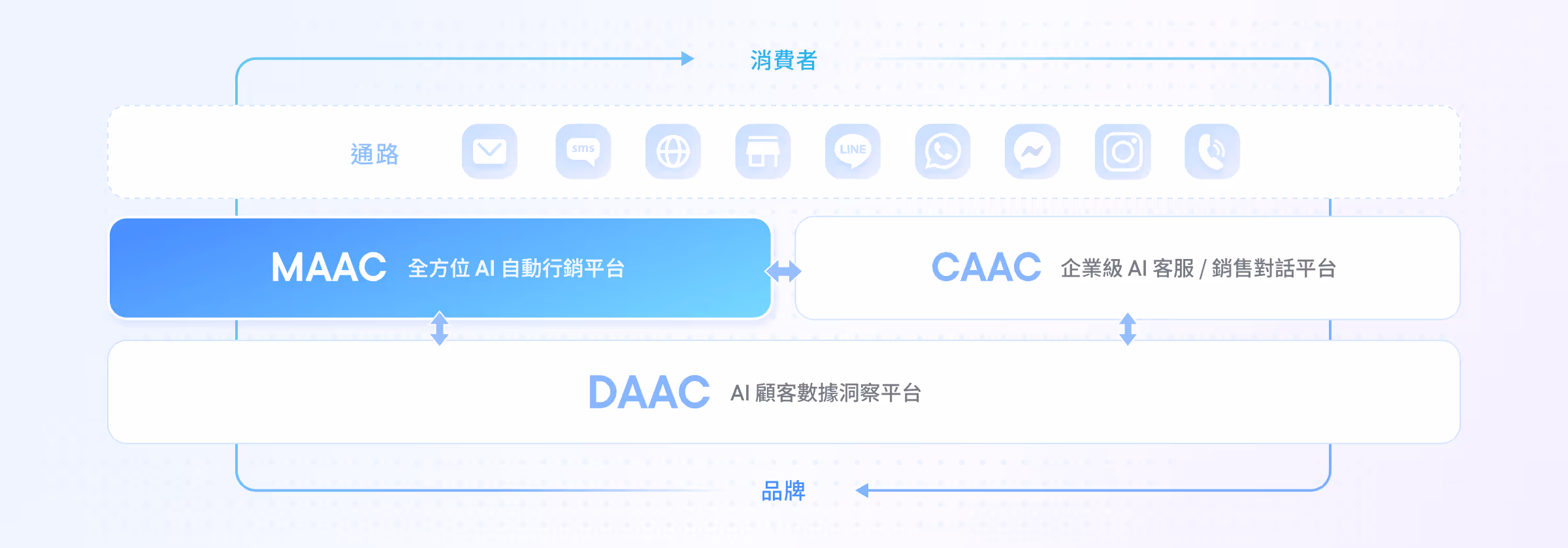 漸強實驗室的商業溝通解決方案中,MAAC 作為行銷核心,幫助品牌高效觸及客戶,串聯 LINE、官網、Email、簡訊、甚至實體通路,並把每一次的客戶回應資料整合進 CAAC、DAAC 系統,讓下一次的互動更個人化。