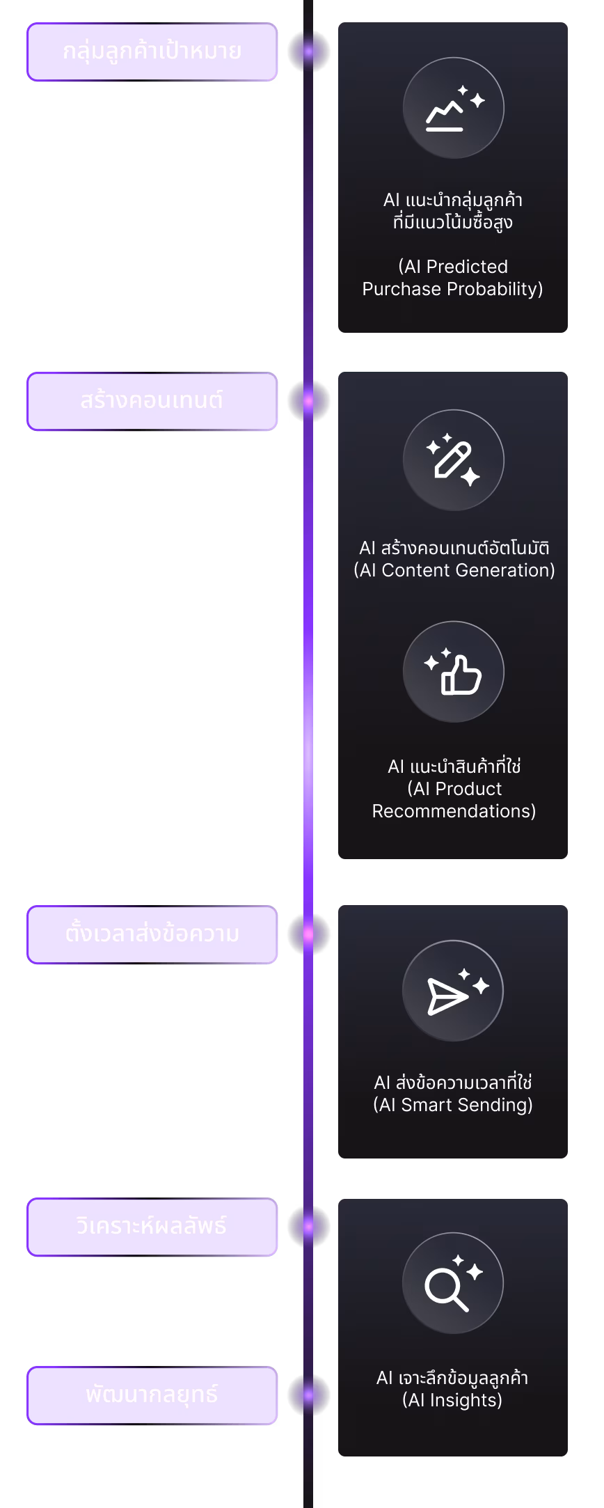 ด้วยพลังแห่ง AI แบรนด์จะสามารถเข้าถึงและ engage กับลูกค้าได้อย่างแม่นยำ รวดเร็ว อัตโนมัติ และเฉพาะบุคคล หรือ personalized มากขึ้น เพิ่มประสิทธิภาพ สร้างประสบการณ์ที่ดีให้ลูกค้า ช่วยเพิ่ม conversion rate ได้อย่างยั่งยืน