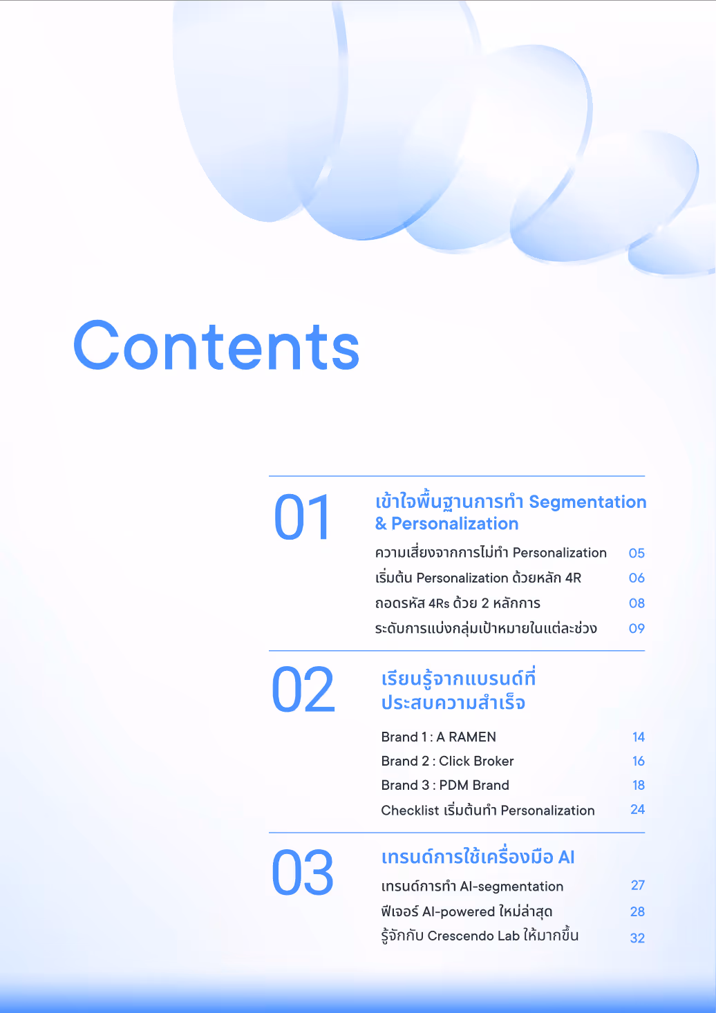 คู่มือ e-book ฉบับนี้รวมเทคนิคที่พิสูจน์แล้วจากกว่า 700 แบรนด์ ช่วยให้คุณก้าวข้ามการสื่อสารแบบ one-size-fits-all เรียนรู้การทำ segmentation ที่ชาญฉลาดขึ้น ปรับแต่งข้อความแบบ personalized ได้ในระดับ scale และเปลี่ยน LINE ให้กลายเป็นช่องทาง CRM ที่ทรงพลัง ด้วยพลังของข้อมูลและ AI