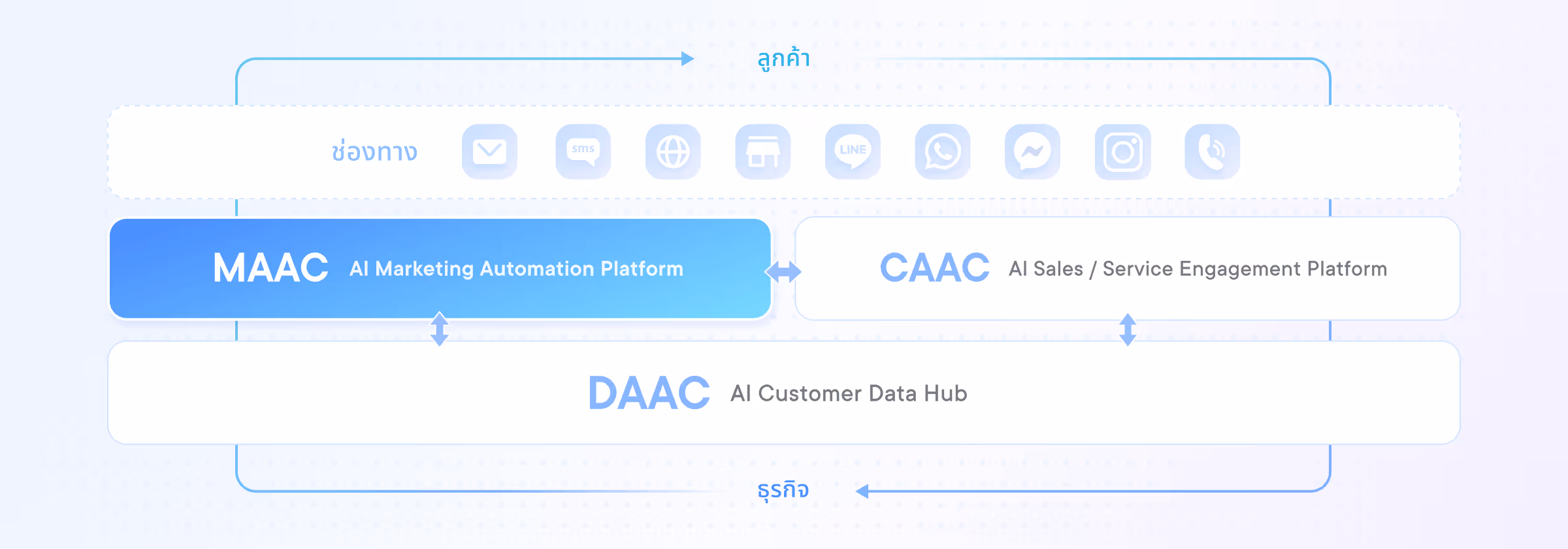 MAAC คือหัวใจสำคัญของกลไกการตลาด (Marketing Engine) ในระบบโซลูชันเพื่อการสื่อสารธุรกิจของ Crescendo Lab ช่วยให้แบรนด์เข้าถึงลูกค้าอย่างมีประสิทธิภาพ ครอบคลุมทั้งบน LINE, เว็บไซต์, Email, SMS, ไปจนถึงหน้าร้าน พร้อมรวบรวมทุกการตอบสนองของลูกค้ากลับเข้าสู่ระบบ CAAC และ DAAC โดยอัตโนมัติ เพื่อยกระดับให้ทุกการปฏิสัมพันธ์ในครั้งต่อๆ ไปมีความแม่นยำ (Targeted) ทันต่อความต้องการ (Timely) และตอบโจทย์ลูกค้าเฉพาะบุคคล (Personalized) ได้ดียิ่งขึ้นกว่าเดิม