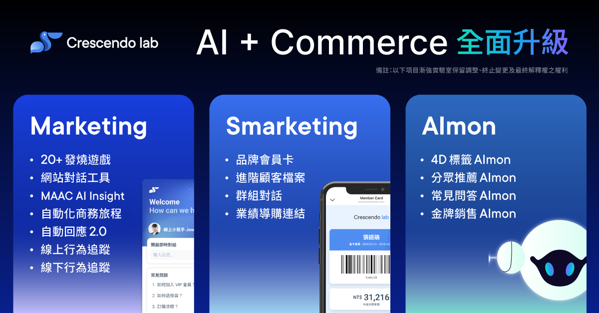 為應對這些趨勢,漸強實驗室以旗下雙產品「全方位 AI 自動行銷平台 MAAC」、「企業級 AI 對話互動平台 CAAC」整合行銷與銷售,也發表共 16 組新功能,升級線上、線下數據追蹤與自動化訊息功能,並引進超過 20 種互動遊戲,幫助品牌玩出更多行銷創意;訊息對話方面,推出網站對話工具及群組對話,讓品牌與消費者互動更多元,尤其群組功能將造福 KOL 團購、一對多服務、B2B 顧客經營等銷售策略。