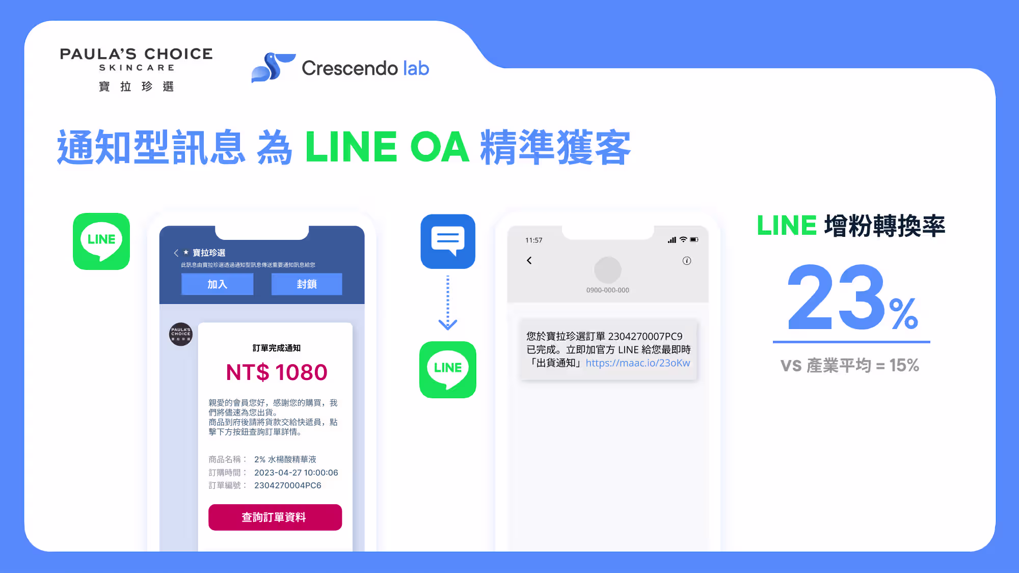 通知型訊息的功能會自動比對手機號碼,以 LINE OA 發送訂單通知,即使顧客非好友也能收到訊息,大部分收到訊息的顧客就會順手加入 LINE OA,精準觸及、獲客成本低於廣告,是許多品牌的增粉利器!即使顧客未點開 LINE,系統也會再傳送簡訊給他,而簡訊連結就能引導顧客前往 LINE 官方帳號。在寶拉珍選發送的通知型訊息中,有 23% 成功轉為 LINE 新好友,而根據我們內部統計,LINE PNP 的平均轉換率約為 15%,可見寶拉珍選的獲客成效顯著。